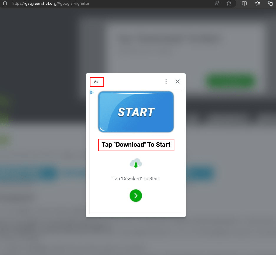 Another ad, superimposed on the page. If I hadn’t looked closely at the text to see the tiny “ad”, what would I have downloaded? I’m 99% sure it would not have been Greenshot.