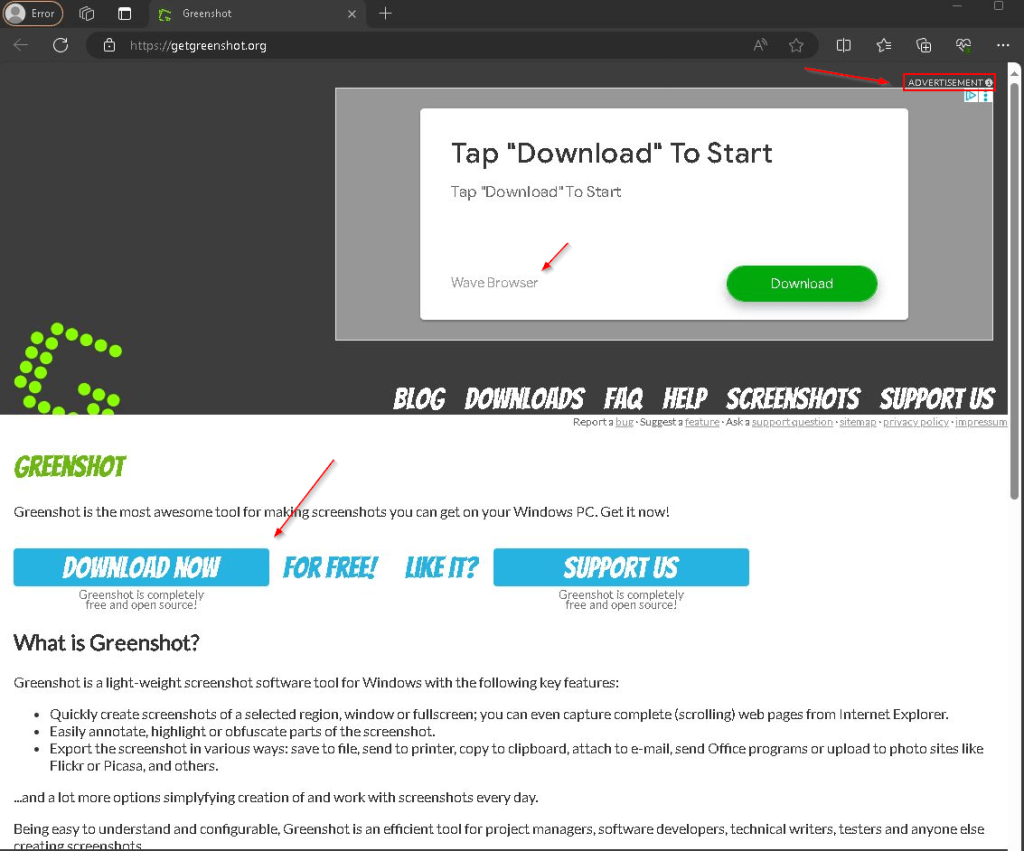 Below you can see my visit to the Greenshot webpage. Look at the shiny green button to “Download”. WAIT. That downloads “Wave Browser”, NOT Greenshot. The window surrounding the obvious download section is an ad (as indicated by the red arrow)!!